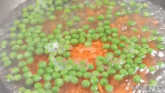 10、肉末炒至變色後,把青豆和胡蘿蔔也倒進去,微微翻炒幾下就可以了,炒勻後盛到一個大碗中。