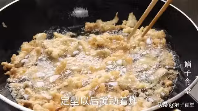 10.轉大火,油溫再次燒熱,放入平菇復炸30秒,這樣能減少平菇吸油。