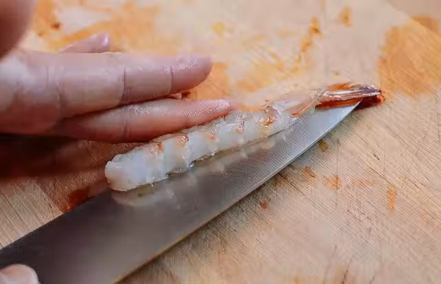 處理好了之後把蝦清洗一下瀝干水分,把蝦放到菜板上放平,把蝦的腹部向著自己,用手按著蝦,把蝦尾部切開然後用手輕輕的推動蝦背把蝦的腹部切開,但是不要切透。