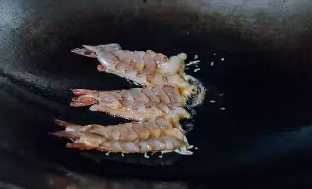 把蝴蝶蝦拿起來放到蛋液裡面裹上一層蛋液,蘸好之後把蝦拎起來讓多餘的蛋液滴乾淨。然後把蝦培根的一面在下放入鍋里。
