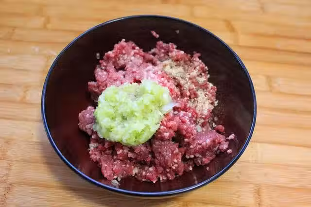 我這裡用的是羊肉,把羊肉清洗乾淨之後攪打成羊肉餡,往肉餡里加入20克生薑末,40克大蔥末,半調羹白糖,4調羹料酒,胡椒粉,適量鹽,用筷子向一邊攪拌均勻上勁。