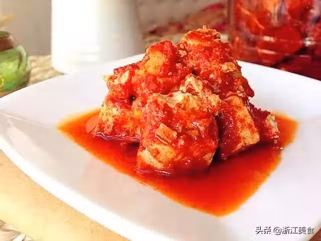 把沾好調料的豆腐塊放入洗乾淨瀝干水的乾淨容器中,再把冷卻好的油倒入容器中。