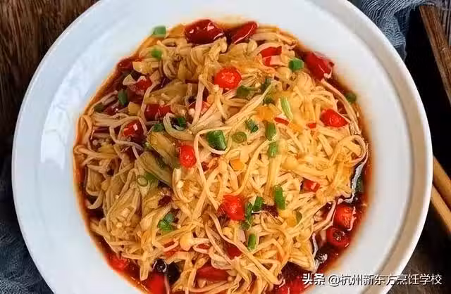 食材:金針菇、小米椒、花椒、干辣椒、蔥蒜、生抽、醋、鹽、辣椒油