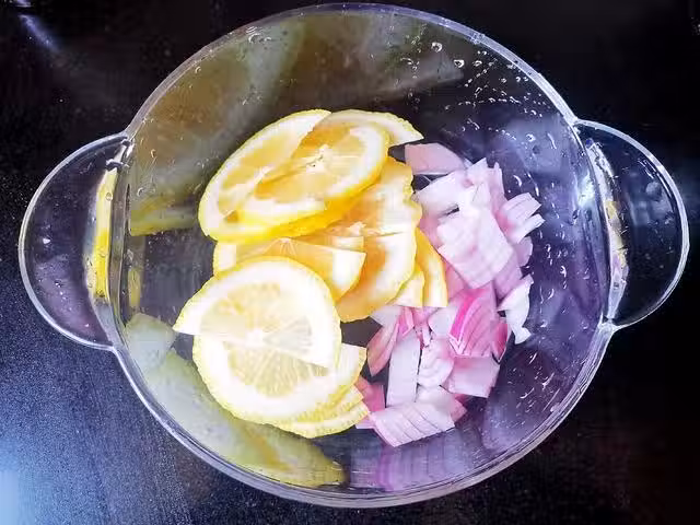 5.把檸檬切片,檸檬切片之前用鹽巴搓洗一下它的表皮,這樣會更加乾淨,因為我們的檸檬是直接切片放進去的,所以要洗乾淨哦,讓後再把洋蔥切碎裝到碗里備用。