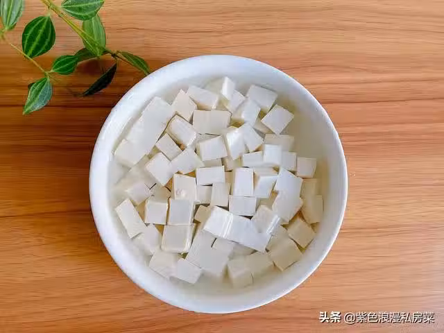 3.豆腐切小塊,放一勺食用鹽,放清水中浸泡,這樣做,可以去豆腐中的豆腥味。