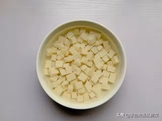 3.豆腐切小塊,放一勺鹽,放清水中浸泡,這樣可以去掉豆腐中的豆腥味。