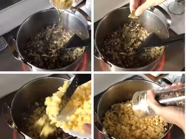 4順序加入白葡萄酒、月桂葉、已切粒的馬鈴薯和黑胡椒碎;