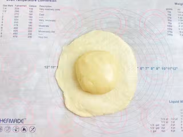 5、10分鐘後,將麵糰稍微擀開,把豆沙餡搓圓後,放在上面,包起來