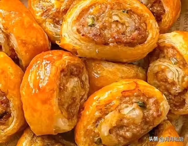 2.手抓餅解凍後平鋪上肉末,撒上一些蔥花捲起來,切成小段,表面刷一層蛋黃液。