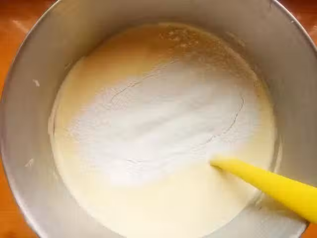 7、接著再把牛奶椰子油沿著盆邊緩慢倒入,全部倒入完畢後,繼續用刮刀翻拌混合均勻,待完全混合均勻後,再加入蔓越莓,大致翻拌一下即可。此時烤箱預熱180度上下火
