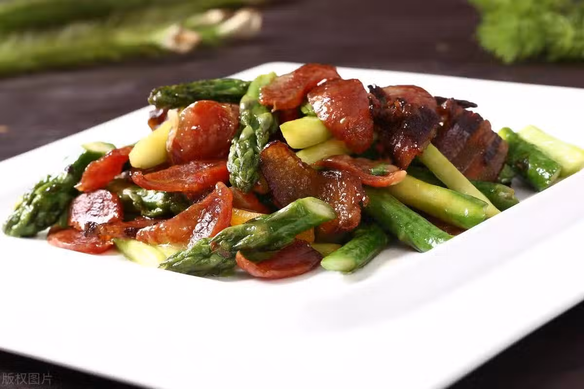 接著放入蘆筍,加些鹽和味精調味,翻炒片刻,就可以出鍋了。