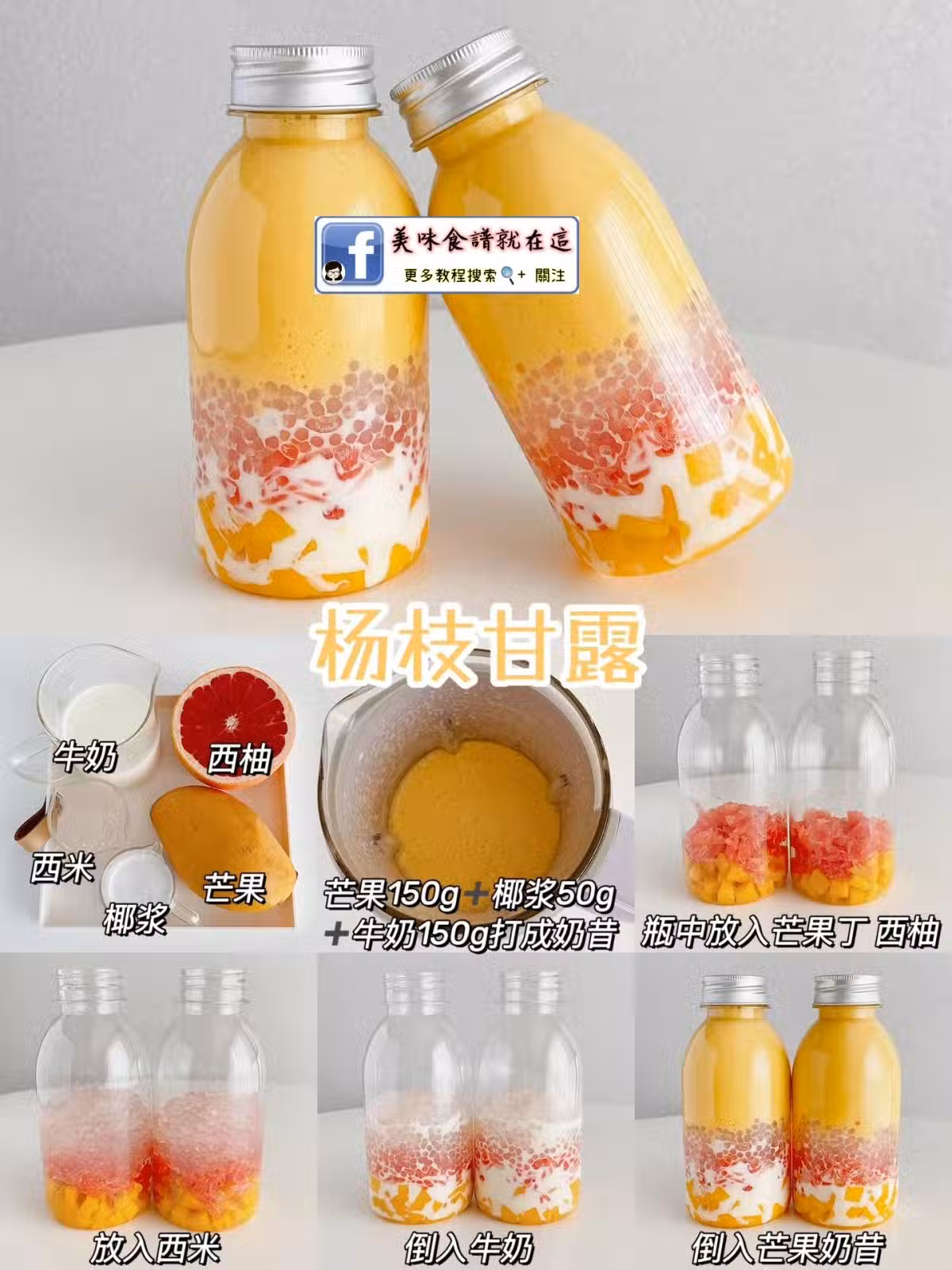 ▪️瓶中依次放入芒果丁,西柚,西米,倒入牛奶和芒果奶昔
