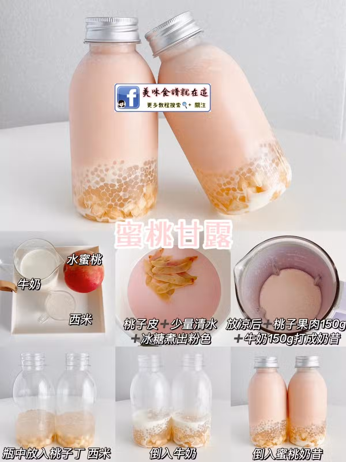 ▪️瓶中依次放入桃子丁,西米,倒入牛奶和蜜桃奶昔