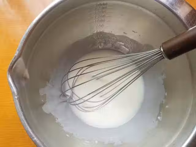 5、然後將60克的低筋麵粉過篩到盆內,用手動打蛋器攪拌至看不見乾粉即可