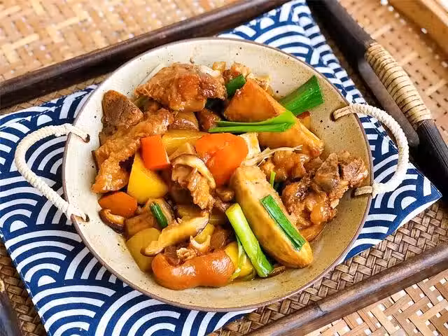 4、燜煮好後,加入胡蘿蔔、土豆等一起燜煮收汁,收汁差不多的時候,加點蒜苗段增香開胃。這樣做出來的豬蹄軟爛入味,醬香濃郁,好吃極了。