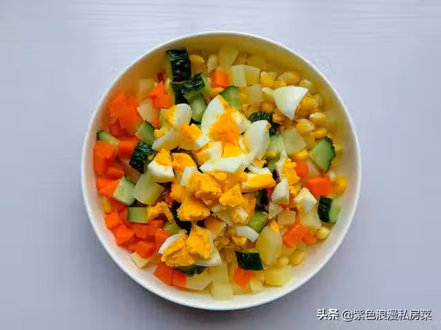 4.雞蛋切小塊,和土豆 胡蘿蔔,黃瓜一起放入盤中。
