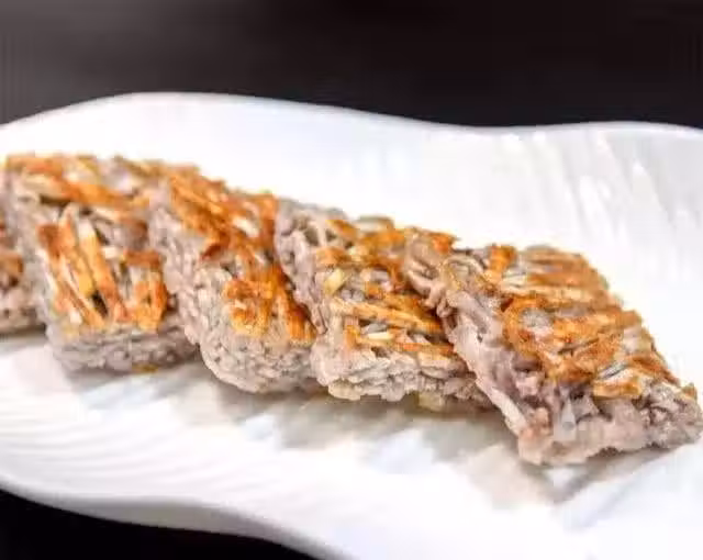 3. 用刀切塊,然後放入煎盤煎至兩面金黃色,出鍋擺盤即可。