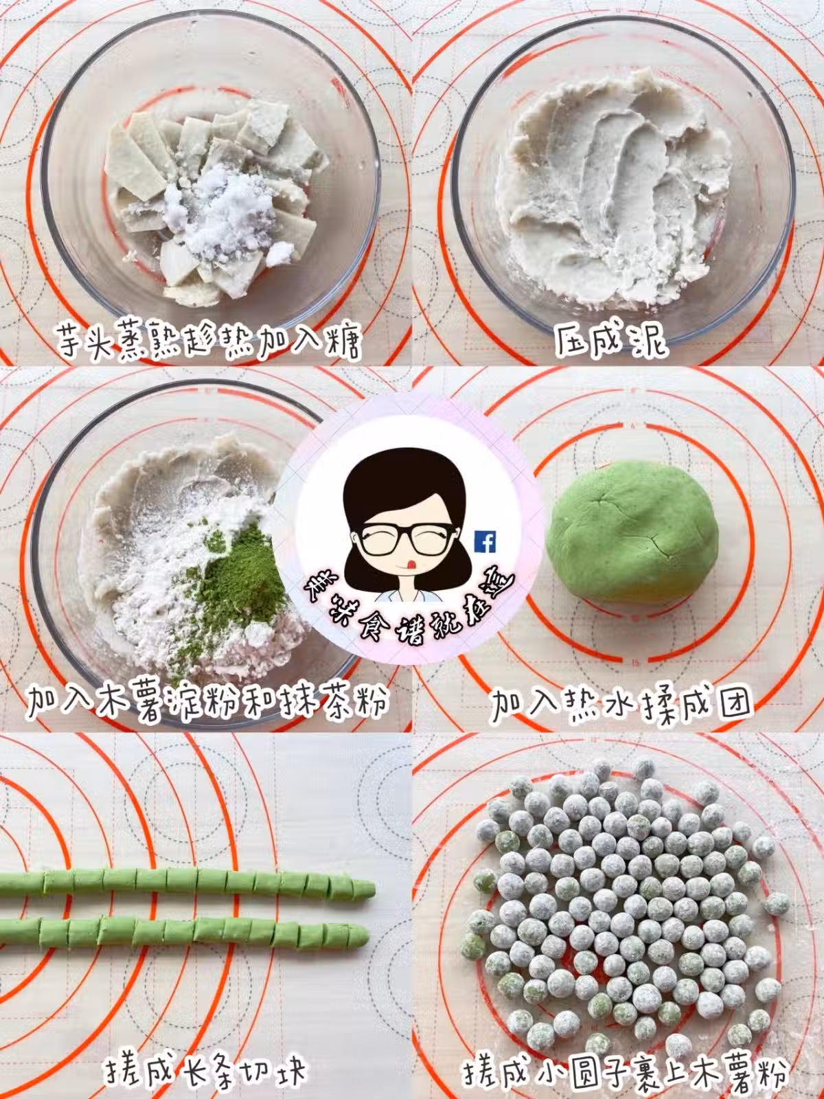 草莓芋圓:芋頭 150克 木薯澱粉 80克 開水 50克 糖 20克 草莓粉 5克