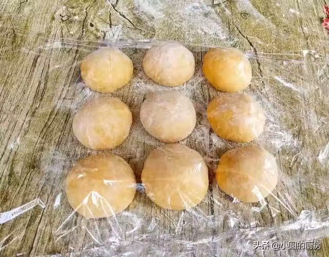 步驟五:十分鐘後,再用手掌把麵糰壓成餅狀,蓋上保鮮膜,第三次醒發十分鐘,經過三次醒發好的麵糰,烙好之後口感會非常的暄軟,好吃