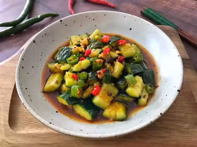 【材料】:黃瓜1條,小米椒2個,青線椒2個,大蒜4瓣,生抽3勺,醋2勺,蚝油1勺,老乾媽1勺,糖適量,油適量