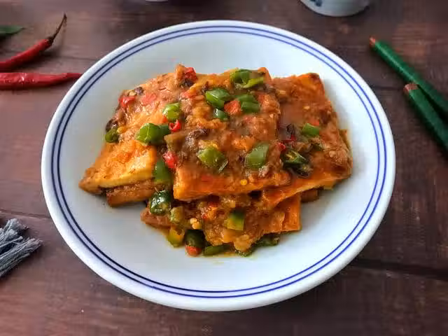 【材料】:老豆腐一塊,八寶醬1大勺,辣椒醬1勺,生抽1勺,青辣椒2個,紅辣椒1個,大蒜2瓣,油適量,麵粉適量