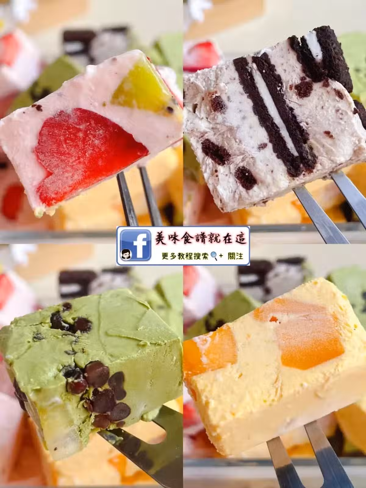 淡奶油800克、酸奶800克、細砂糖80克、芒果肉150克、草莓200克、抹茶粉5克、奧利奧餅乾碎25克、裝飾水果適量、奧利奧餅乾適量
