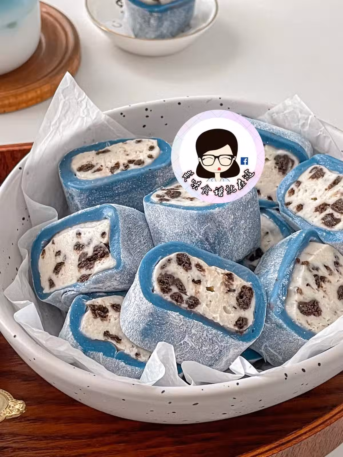 🌀糯米皮:糯米粉160g 玉米澱粉20g 蝶豆花粉4g 白砂糖20g 牛奶220g 黃油15g