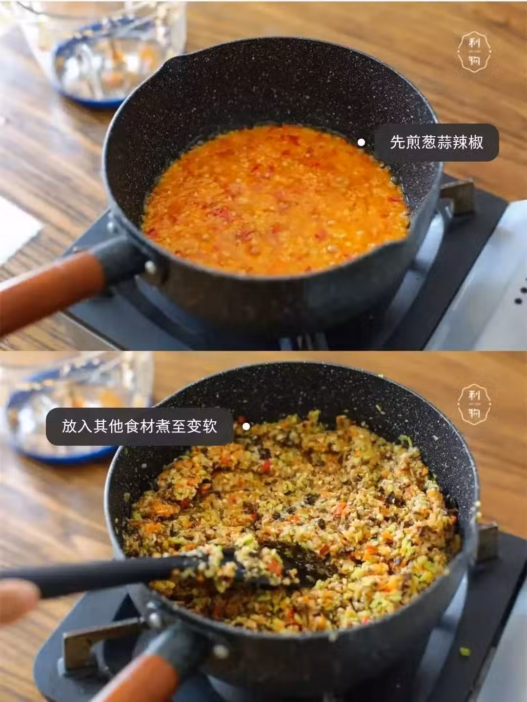 再倒入其他蔬菜末,加少許鹽,不停地攪動翻拌,之後香菇會慢慢出水,食材也會慢慢變軟。