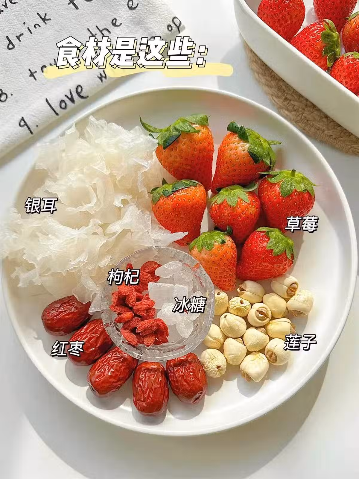 首先準備食材:銀耳、草莓、蓮子、枸杞、冰糖、紅棗。