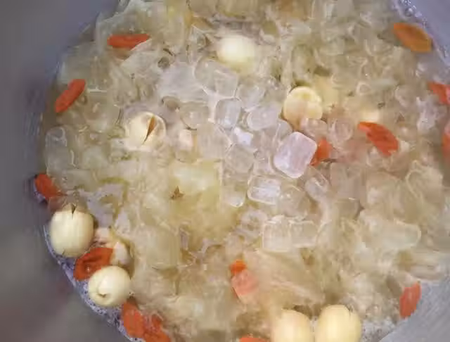 第四步,加上適量的清水,要保證不中途另外加水,開始煮,差不多半個小時的時間,便可看到糖水變得粘稠了,這是因為銀耳出膠了,繼續煮一煮;
