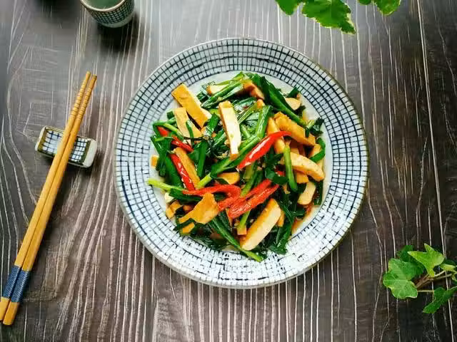 【所需食材】:香乾3塊、韭菜一把、大蒜一小個、生抽適量、辣椒一個、食用鹽適量、食用油適量。