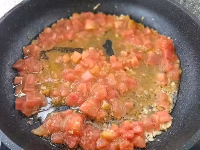7、 往鍋里加入耗油和生抽,然後翻炒一下西紅柿碎,等一到兩分鐘之後,往鍋里加一小碗水,這個清水的量根據培根卷的數量來決定,基本一會兒可以浸過培根卷的底就可以了。