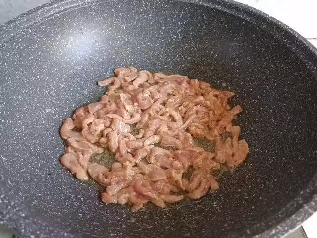 6、油熱了之後,將切好的肉絲倒入鍋中,加大火,用勺子進行快速翻炒,慢慢的鍋中的肉已經變色,這時候就可以撈出放在盤中。