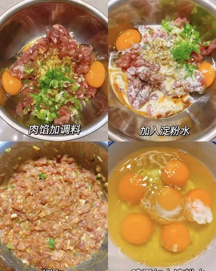 ①肉餡里加入雞蛋、蔥、姜、生抽、料酒、鹽、黑胡椒粉、澱粉水抓勻
