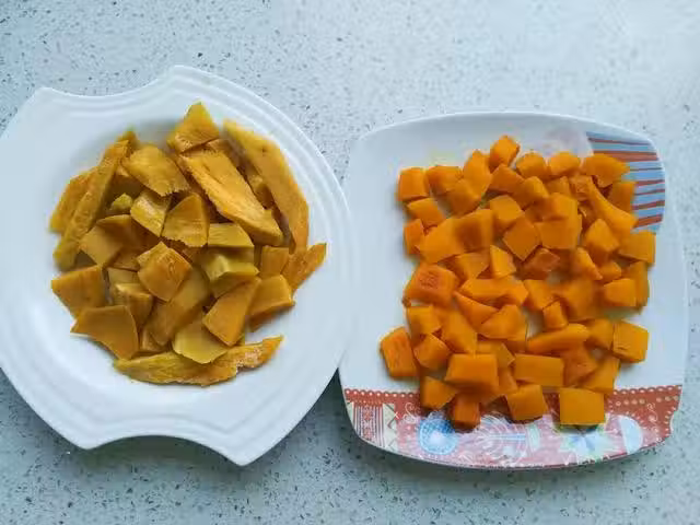 蒸熟之後將紅薯和南瓜混合在一起,加入適量的牛奶攪拌成糊狀,攪拌好之後放涼。加入紅薯南瓜泥之後可以在一起程度上改善玉米面蛋糕的口感。南瓜糊可以一次多做一點,吃不掉的剩下來做饅頭用也可以,或者做成糯米餅也可以。