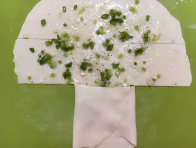 第四步,再撒上一層蔥花,將面片沿著半徑切成6、8份,不要切斷,再將切好的面片摺疊起來,最後擀成一個薄餅胚,在鍋中刷上少許的食用油;