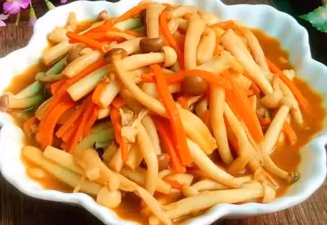 5.鍋中倒油,油熱加入蒜末爆香,放胡蘿蔔絲炒至斷生,倒入雙菇,炒出雙菇的水分,再倒入調好的料汁。