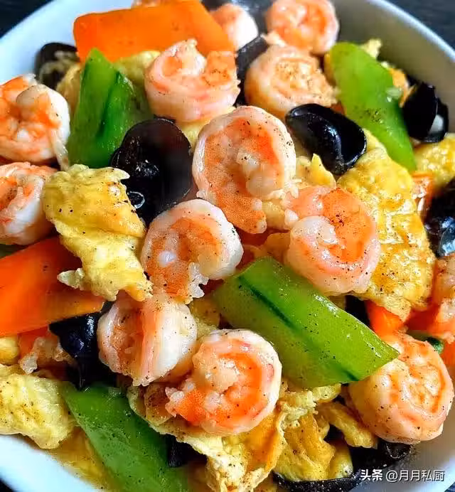3.鍋中留底油,倒入蝦仁炒至變色,加入蒜末炒香,放入木耳胡蘿蔔黃瓜,加入雞蛋,大火快速翻炒片刻,要少許食鹽,生抽,胡椒粉翻炒均勻後加入水澱粉勾芡,翻炒幾下即可出鍋。
