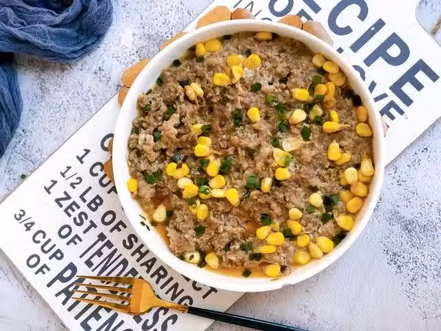 3、將肉餅放入盤子中,加入點甜玉米,等鍋中水煮沸後,將其上鍋蒸製,大火蒸10分鐘左右即可出鍋。