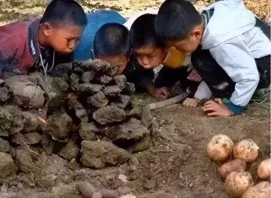 除了抓魚,當時的孩子們不知道從哪裡搞到的紅薯找一片土地,在地上挖一個坑,將柴火完全引燃以後,將紅薯埋到炭火中,用余熱慢慢的將紅薯烤熟。