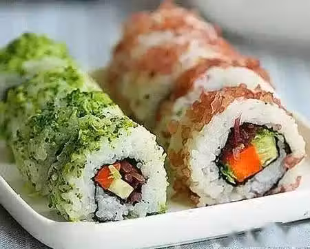 8、內卷:海苔上鋪一層米飯,放上胡蘿蔔黃瓜,西蘭花碎、血珊瑚草捲起即可。(吃的時候沾壽司醬油)