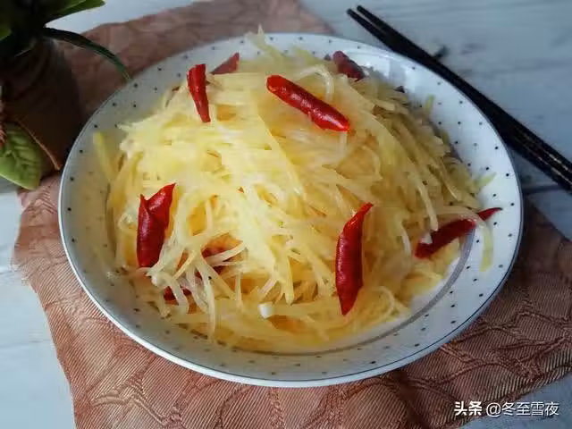 材料:土豆2個、油鹽適量、蔥1段、姜2片、大蒜2瓣、干辣椒10個、花椒10粒、米醋2湯匙