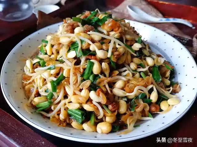 黃豆芽400克、韭菜1把、豬肉150克、油鹽適量、姜1片、大蒜2瓣、料酒1湯匙、生抽醬油1湯匙、米醋少許、