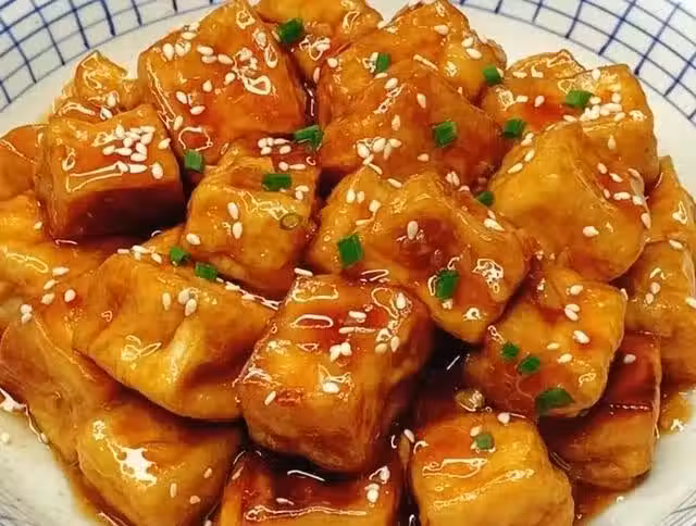 1.豆腐切成方塊,裹上一層薄薄的玉米澱粉,放在油鍋中炸至表面金黃,撈出控油。