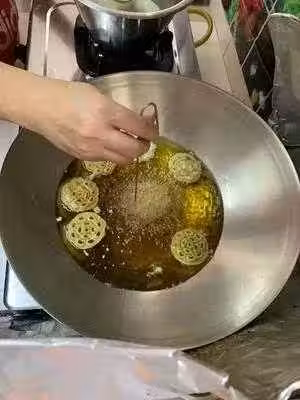 4、炸的時候需要兩面反轉炸至金黃色就可以撈起來,瀝干油分待涼就可以放進餅桶里了。