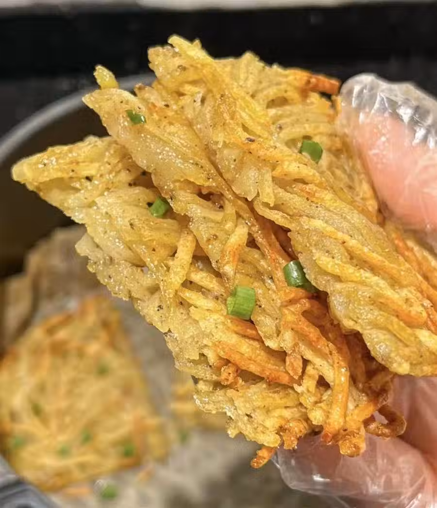 油紙刷上一層油,鋪上土豆絲,表面再噴一點油,180度烤15分鐘,中途翻面,出鍋撒上辣椒麵和蔥花!!喜歡焦香酥脆的可以多烤一下