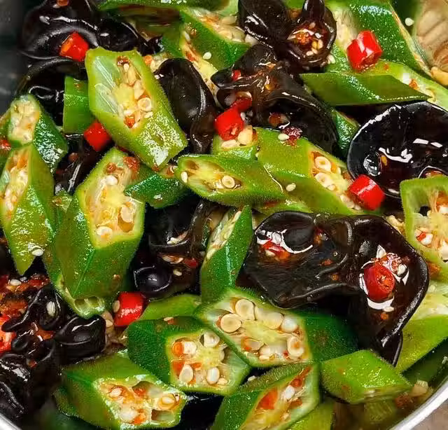 食材準備:秋葵,木耳,小米辣,白芝麻,大蒜,小米辣,白芝麻,生抽,陳醋,食鹽