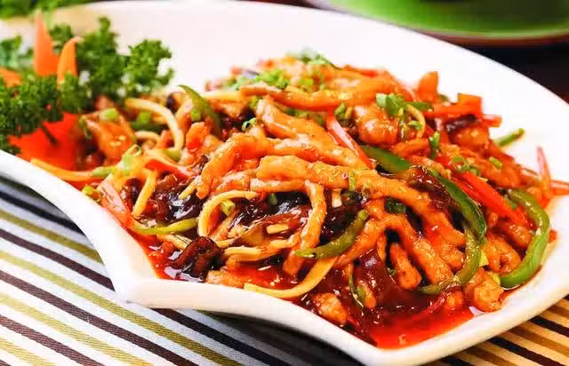 4、再加入肉絲、加入胡蘿蔔絲、青椒絲、1小勺醋、半小勺白糖。