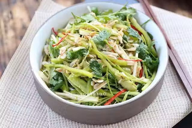 食材:尖椒2個、蔥1棵、蝦皮1把、香菜2棵、紅椒1/2個、食鹽1/3勺、醬油1勺、醋1/2勺、雞精少許、香油適量