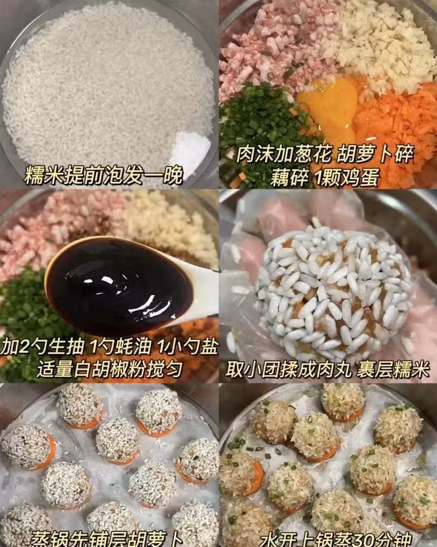 ①糯米提前泡發一晚②肉末加蔥花、胡蘿卜碎、藕碎,1顆雞蛋,加2勺生生抽、1勺蠔油、1小勺鹽、適量白鬍椒粉攪勻③肉餡揉成丸子,外面裹層糯米④蒸鍋先鋪層胡蘿卜,放入丸子,水開上鍋蒸 30分鐘,出鍋撒蔥花即可!!